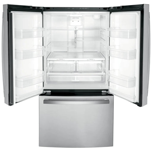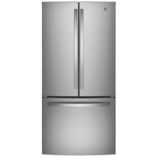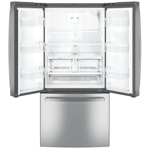 • GE GNE25JYKFS French Door Refrigerator, 33 inch Width, ENERGY STAR Certified, 24.7 cu. ft. Capacity, Water Dispenser (Interior), Ice Dispenser (Freezer Located), Stainless Steel colour