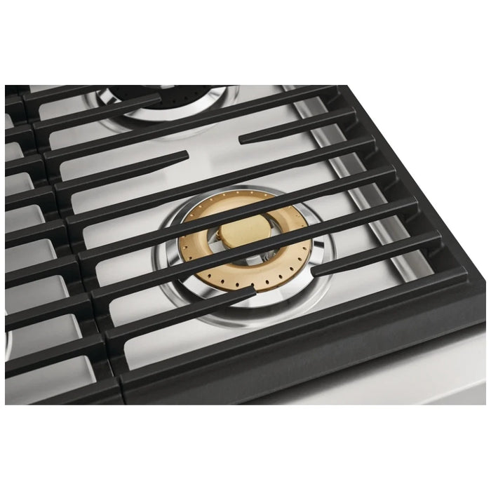 Full-framed linear grates, sturdy knobs, premium brass burner accents and the Electrolux signature pinstriped glass lend to the sleek design that make this range a focal point of your kitchen