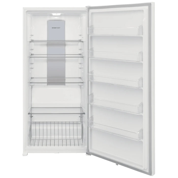 This Frigidaire 20 cubic foot upright freezer includes a superior tight seal that locks in cold air, keeping food frozen for two days if there is a power outage, and the EvenTemp™ Cooling System, with a variable speed compressor that constantly circulates cold air throughout the freezer with smart sensing technology that adjusts air flow to maintain a uniform temperature. The flexible interior organization system enables you to easily organize your family's frozen favorites with four adjustable, full-width glass shelves, deep bottom basket, and five spacious door bins.